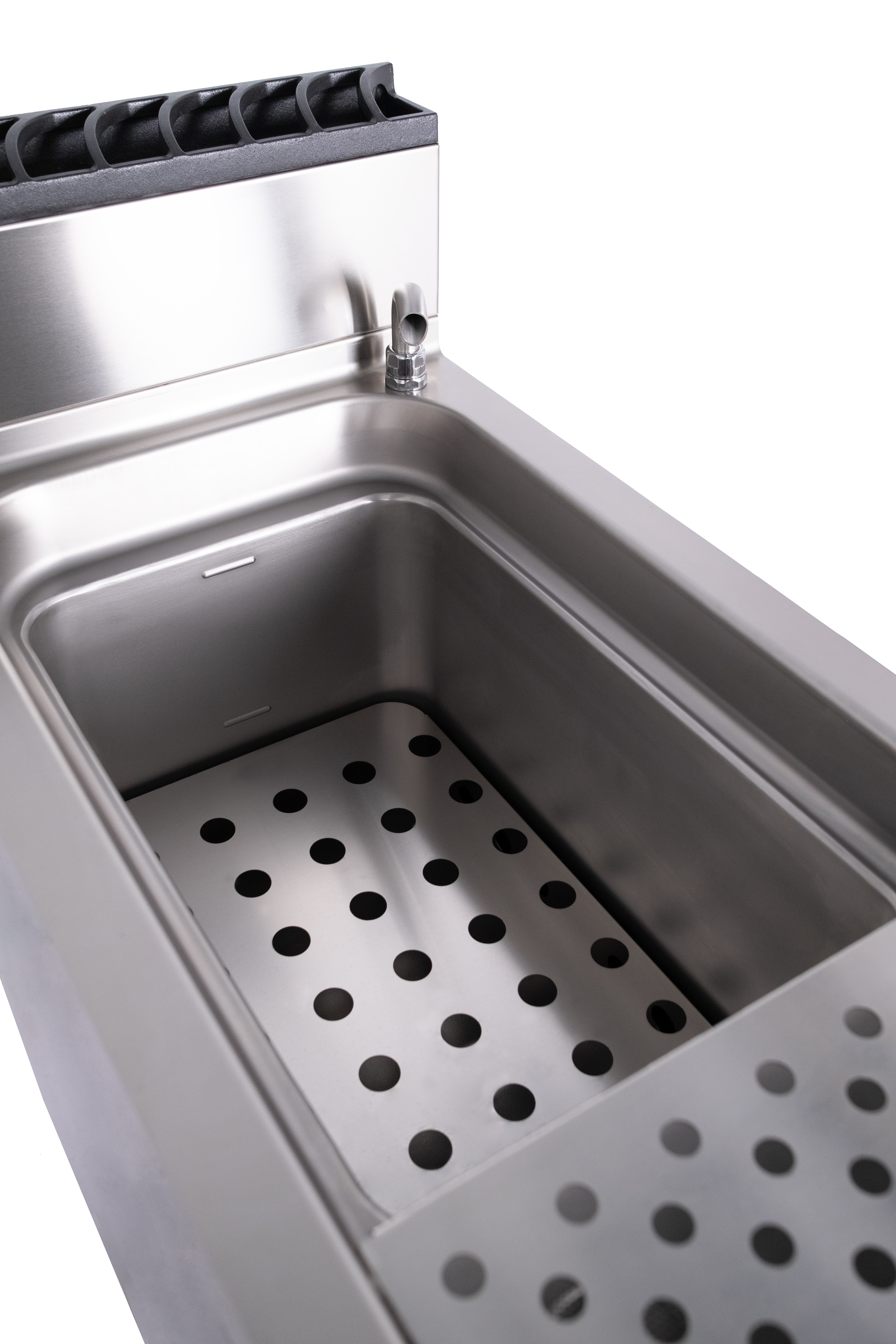 Trento’s burner design directs heat toward the rear of the tank, creating a natural convection flow. This gently stirs the pasta without the need for manual tossing, while starches are carried to a skim drain, keeping the water clearer for longer cooking runs.