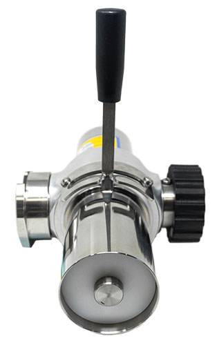 The Portion Head (Item 46180) functions thanks to a cylindrical compartment divided into two smaller compartments with identical volumes. These can be adjusted to give portions of the desired size. The pressure provided by the filler/stuffer to which the Portion Head is attached propels the meat mixture into each of the two compartments alternately. The mixture is then forced out of the portioner through a funnel or through the optional curved nozzle with cutting valve (VD). The time at which each of the two compartments is to be filled is controlled manually with the control lever.